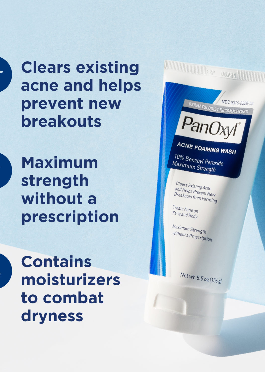 Clear, treat and prevent even the worst breakouts with PanOxyl 10% Benzoyl Peroxide Maximum Strength Acne Foaming Wash.